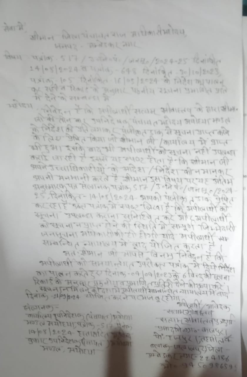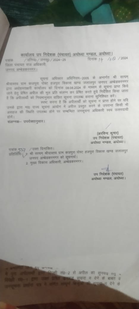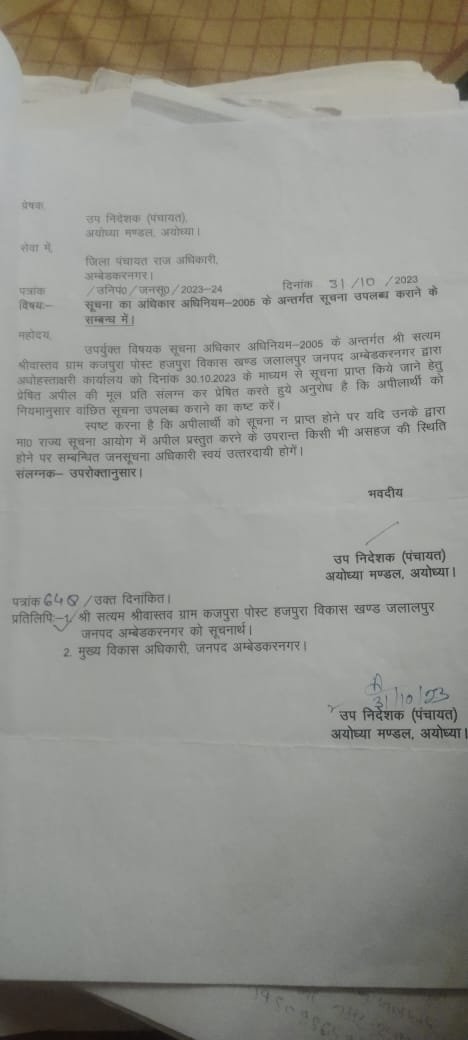 अंबेडकर नगर। (आशा भारती नेटवर्क) जलालपुर तहसील अन्तर्गत कजपुरा ग्रामसभा में प्रधानमंत्री आवास ग्रामीण के सम्बन्ध में सूचना प्राप्त करने हेतु समाजसेवी सत्यम श्रीवास्तव ने 4 अप्रैल 2023 को ही आवेदन पत्र प्रेषित किया जिसके बाद ग्राम सचिव अमरजीत शर्मा ने कार्यालय खण्ड विकास अधिकारी जलालपुर के पत्रांक 11 दिनांकित 12 अप्रैल 2023 के माध्यम से सत्यम श्रीवास्तव से 521पेज के बाबत प्रति पेज का 5 रूपये की दर से कुल 2605 रूपये ग्रामपंचायत कजपुरा के ग्राम निधि प्रथम खाता संख्या -16560100027098 में जमाकर जमा रशीद की मांग की गई आवेदक सत्यम श्रीवास्तव ने इस अवैध धन के मांग के विषय पर मुख्य विकास अधिकारी अम्बेडकर नगर को एक पत्र इस आशय का पंजीकृत डाक से प्रेषित किया कि आवास सम्बन्धी सूचना वर्ष 2015 से वर्ष 2023 के मध्य 521 पेज की हो जायेगी और प्रति पेज का 5 रूपये की दर से अधिनियम में कहीं उल्लेख नहीं है बल्कि प्रति पेज का अतिरिक्त शुल्क केवल 2 रूपये प्रति पेज की दर से ही लगता है , यह सूचना जो अमरजीत शर्मा के उक्त मांग पत्र में उल्लेख है 2605रूपये का यह केवल आवेदक सत्यम श्रीवास्तव को गुमराह करने हेतु दिये गये मांग पत्र संलग्न कर भेजा फिर भी कोई जबाब न मिलने पर आवेदक समाजसेवी सत्यम श्रीवास्तव ने प्रथम अपीलीय अधिकारी/उपनिदेशक पंचायत अयोध्या मण्डल के यहां प्रथम अपील 6जून 2023को पंजीकृत डाक से भेजा और दो बार अनुस्मारक पत्र भी उपनिदेशक पंचायत अयोध्या मण्डल को भेजा तो पुनः वही ग्राम सचिव अमरजीत शर्मा जो उक्त जनसूचना के जबाब हेतु 521पेज के बाबत 2605 रूपये की मांग किया था वही अमरजीत शर्मा ने 6पेज की आवास की सूची वह भी वर्ष को हाथ से लिखकर सत्यम श्रीवास्तव को भेजें इससे यह स्पष्ट है कि प्रधानमंत्री आवास ग्रामीण कजपुरा ग्रामसभा में आवंटन में धांधली हूई है जबकि सत्यम श्रीवास्तव ने 6 बिन्दुओं पर सूचना मांगा है। सत्यम श्रीवास्तव ने पुनः उक्त गलत और भ्रामक प्राप्त सूचना की छायाप्रति संलग्न कर प्रथम अपीलीय अधिकारी उपनिदेशक पंचायत अयोध्या मण्डल को एक पत्र दिनांक 14 अगस्त 2023 को भेजा तो उपनिदेशक पंचायत अयोध्या मण्डल अयोध्या ने जिलापंचायत राज अधिकारी अम्बेडकर नगर को एक पत्र, पत्रांक संख्या 648/उनिंपं0/जनसू0/2023-24 , दिनांकित 30अक्टूबर 2023 को भेजा जिसकी एक प्रति सत्यम श्रीवास्तव को भी प्राप्त हूई जिसमें डीपीआरओ को निर्देशित किया गया कि सत्यम श्रीवास्तव को सूचना उपलब्ध कराई जाये सूचना न मिलने पर सत्यम श्रीवास्तव ने दिनांक 17 नवम्बर 2023 को जिलापंचायत राज अधिकारी अम्बेडकर नगर को पत्रांक 648 संलग्न कर भेजा सूचना प्राप्त करने हेतु पर जिला पंचायत राज अधिकारी अम्बेडकर नगर कोई सूचना नहीं दिये इसके बाद आवेदक लगातार उपनिदेशक पंचायत अयोध्या मण्डल अयोध्या अरविंद क