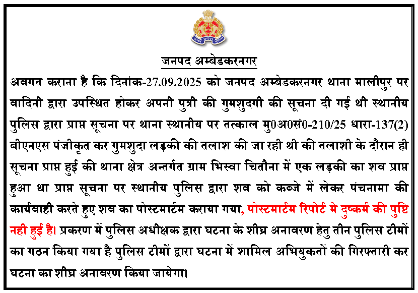 गिरजा शंकर गुप्ता/अंबेडकर नगर। मालीपुर थाना क्षेत्र के भस्मा चितौना गांव में नाबालिग छात्रा की हत्या का सनसनीखेज खुलासा पुलिस ने कर दिया है। जांच में सामने आया कि वारदात को अंजाम किसी बाहरी ने नहीं बल्कि छात्रा के ही प्रेमी ने दिया। पुलिस ने आरोपी को गिरफ्तार कर जेल भेज दिया है।पुलिस अधीक्षक अभिजीत आर शंकर ने बताया कि 27 सितंबर को छात्रा की गुमशुदगी दर्ज हुई थी। अगले दिन गांव के बाहर खेत में उसका शव मिला।