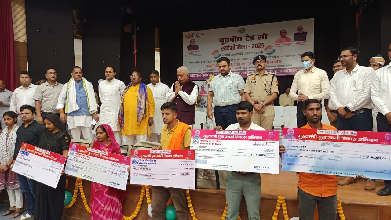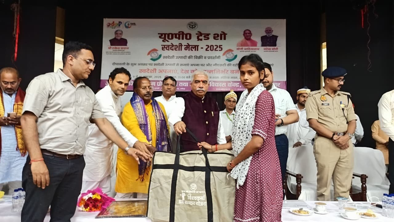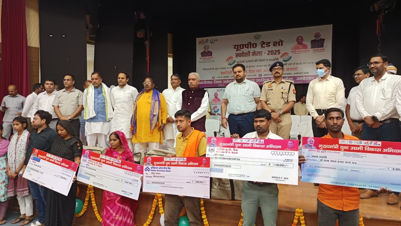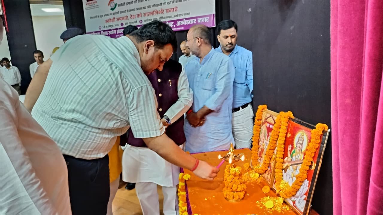 यू०पी० इंटरनेशनल ट्रेड शो-2025 के अंतर्गत जनपद स्तर पर आयोजित 10 दिवसीय स्वदेशी मेला-2025 का भव्य शुभारंभ माननीय कैबिनेट मंत्री सूक्ष्म लघु एवं मध्यम उद्यम, खादी ग्रामोद्योग, रेशम उद्योग, हथकरघा तथा वस्त्र उद्योग विभाग उत्तर प्रदेश श्री राकेश सचान द्वारा लोहिया भवन सभागार में फीता काटकर किया गया। इस अवसर पर माननीय विधायक कटेहरी श्री धर्मराज निषाद, माननीय अध्यक्ष जिला पंचायत श्री श्याम सुंदर वर्मा उर्फ साधु वर्मा, जिलाधिकारी श्री अनुपम शुक्ला, जिला अध्यक्ष भाजपा श्री त्र्यंबक तिवारी एवं भाजपा नेता श्री रमाशंकर सिंह उपस्थित रहे।