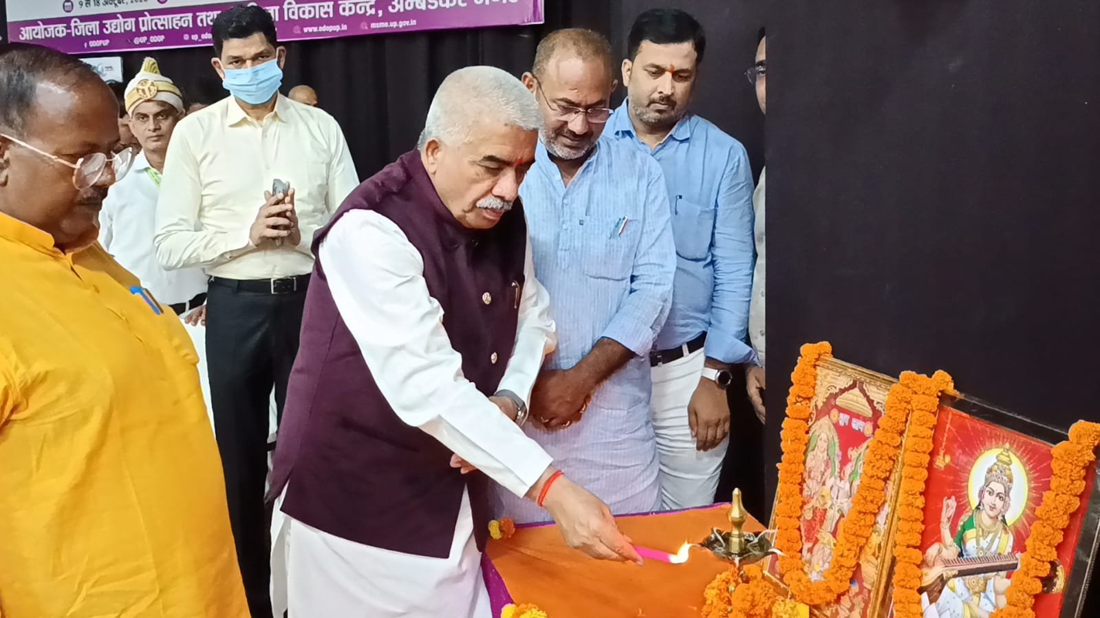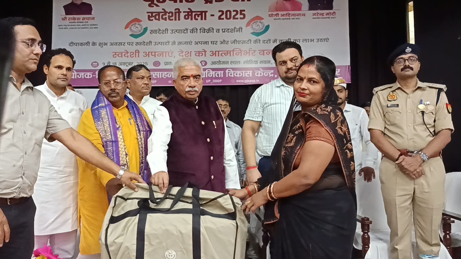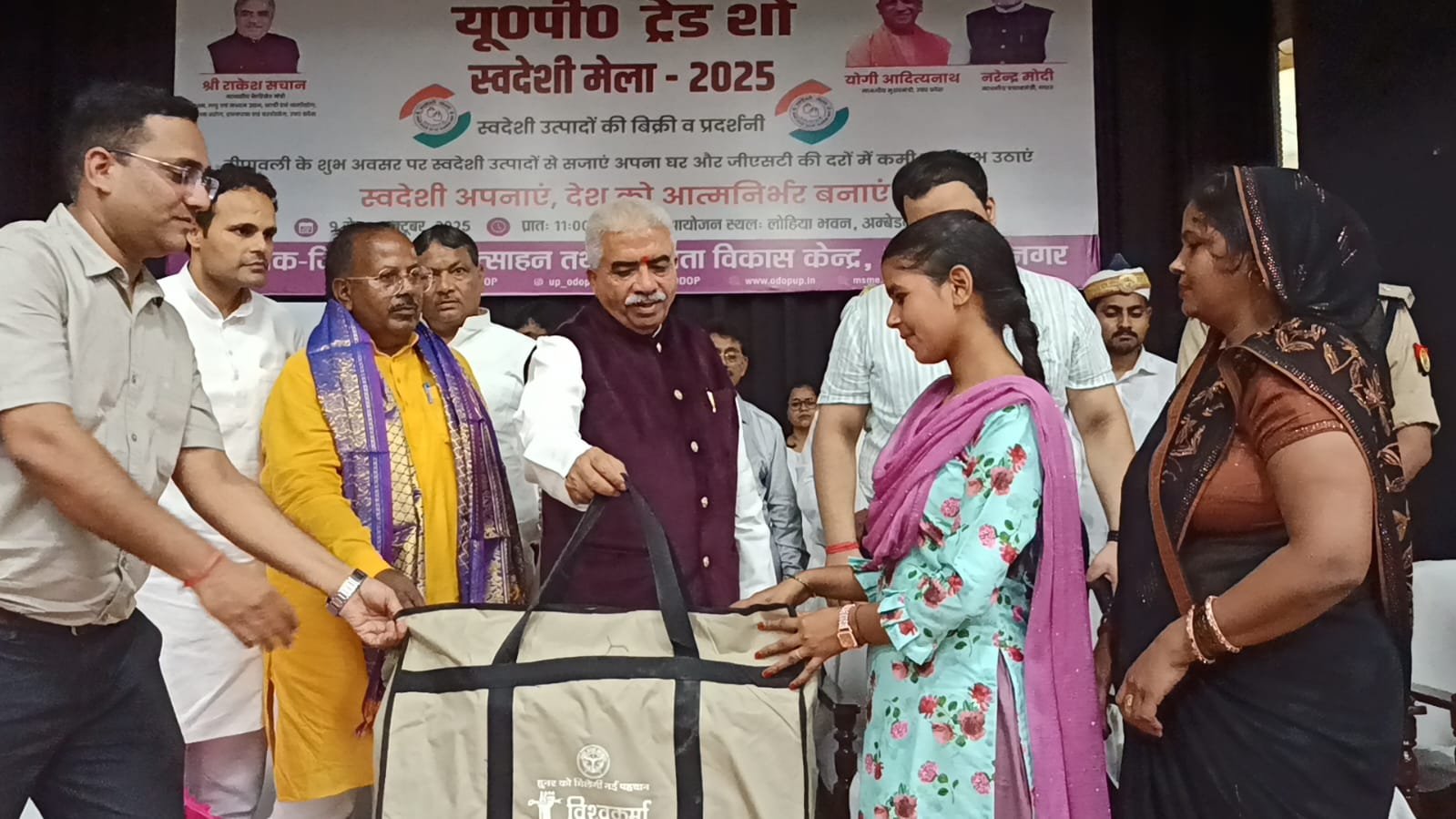 यू०पी० इंटरनेशनल ट्रेड शो-2025 के अंतर्गत जनपद स्तर पर आयोजित 10 दिवसीय स्वदेशी मेला-2025 का भव्य शुभारंभ माननीय कैबिनेट मंत्री सूक्ष्म लघु एवं मध्यम उद्यम, खादी ग्रामोद्योग, रेशम उद्योग, हथकरघा तथा वस्त्र उद्योग विभाग उत्तर प्रदेश श्री राकेश सचान द्वारा लोहिया भवन सभागार में फीता काटकर किया गया। इस अवसर पर माननीय विधायक कटेहरी श्री धर्मराज निषाद, माननीय अध्यक्ष जिला पंचायत श्री श्याम सुंदर वर्मा उर्फ साधु वर्मा, जिलाधिकारी श्री अनुपम शुक्ला, जिला अध्यक्ष भाजपा श्री त्र्यंबक तिवारी एवं भाजपा नेता श्री रमाशंकर सिंह उपस्थित रहे।