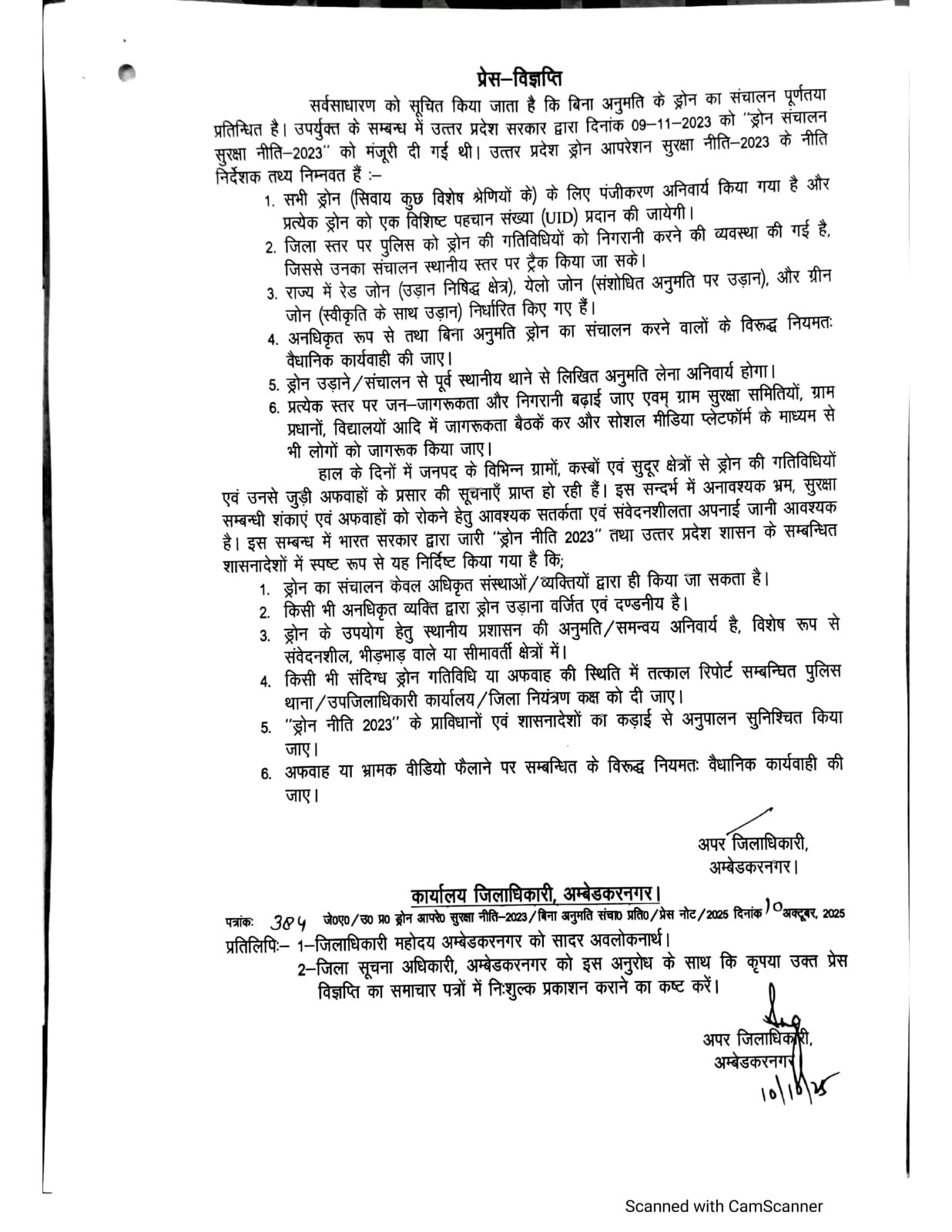 हाल के दिनों में जनपद के विभिन्न ग्रामों, कस्बों एवं सुदूर क्षेत्रों से ड्रोन की गतिविधियों एवं उनसे जुड़ी अफवाहों के प्रसार की सूचनाएँ प्राप्त हो रही हैं। इस सन्दर्भ में अनावश्यक भ्रम, सुरक्षा सम्बन्धी शंकाएं एवं अफवाहों को रोकने हेतु आवश्यक सतर्कता एवं संवेदनशीलता अपनाई जानी आवश्यक है। इस सम्बन्ध में भारत सरकार द्वारा जारी “ड्रोन नीति 2023” तथा उत्तर प्रदेश शासन के सम्बन्धित शासनादेशों में स्पष्ट रूप से यह निर्दिष्ट किया गया है कि;