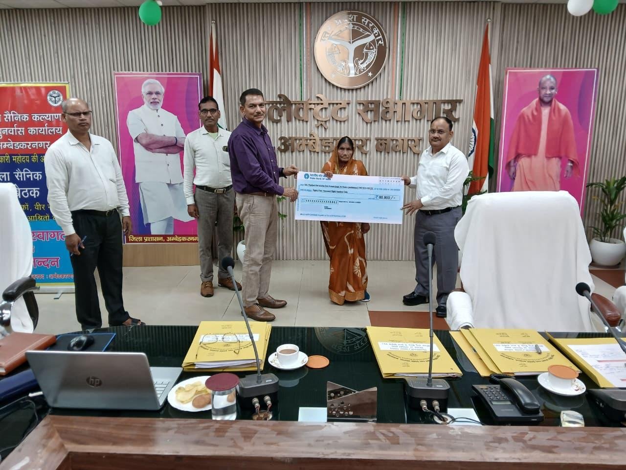 सन् 1965 भारत पाकिस्तान युद्ध में शहीद हवलदार देबी प्रकाठ की पत्नी वीर नारी श्रीमती फुलपती देवी को रू0 85,800-00 रूपये का वार्षिक अनुदान जो उत्तर प्रदेश सरकार द्वारा दिया जाता है जिसे चेक देकर सम्मानित किया गया।