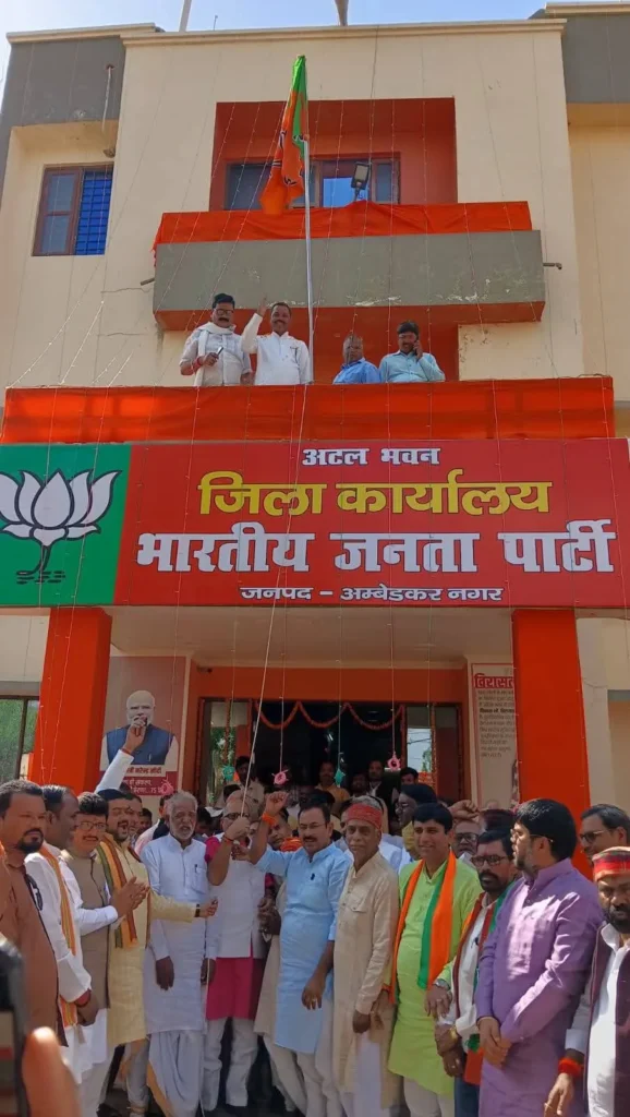 अंबेडकर नगर। (आशा भारती नेटवर्क) भाजपा की 47 वें स्थापना दिवस पर भाजपा जिलाध्यक्ष त्रयंबक तिवारी के नेतृत्व में भाजपा जिला कार्यालय अटल भवन पर भाजपा का ध्वज फहराया गया। डॉ श्यामा प्रसाद मुखर्जी एवं पण्डित दीनदयाल उपाध्याय के चित्र पर माल्यार्पण किया गया।ध्वजारोहण के उपरांत सैकड़ों कार्यकर्ताओं से भरे मीटिंग हाल में गोष्ठी का आयोजन किया गया। नगर पालिका और नगर पंचायतों में शासन द्वारा नामित सभासदों का अंग वस्त्र भेंट कर स्वागत किया है।