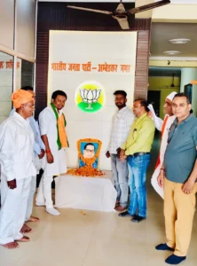 अंबेडकर नगर।(आशा भारती नेटवर्क संविधान शिल्पी बाबा साहेब डॉ भीम राव अम्बेडकर की 135 वीं जयंती पर भाजपा जिलाध्यक्ष त्रयंबक तिवारी के मार्गदर्शन एवं जिला संयोजक/ जिला उपाध्यक्ष विमलेंद्र प्रताप सिंह मोनू के संयोजन में भाजपा जिला कार्यालय सहित जिले भर के बूथों पर भाजपा कार्यकर्ताओं ने डॉ अंबेडकर के मूर्तियों की साफ सफाई, दीपदान और चित्र पर माल्यार्पण कर नमन किया। इस अवसर पर भाजपा जिला कार्यालय को झालर से सजाया गया।